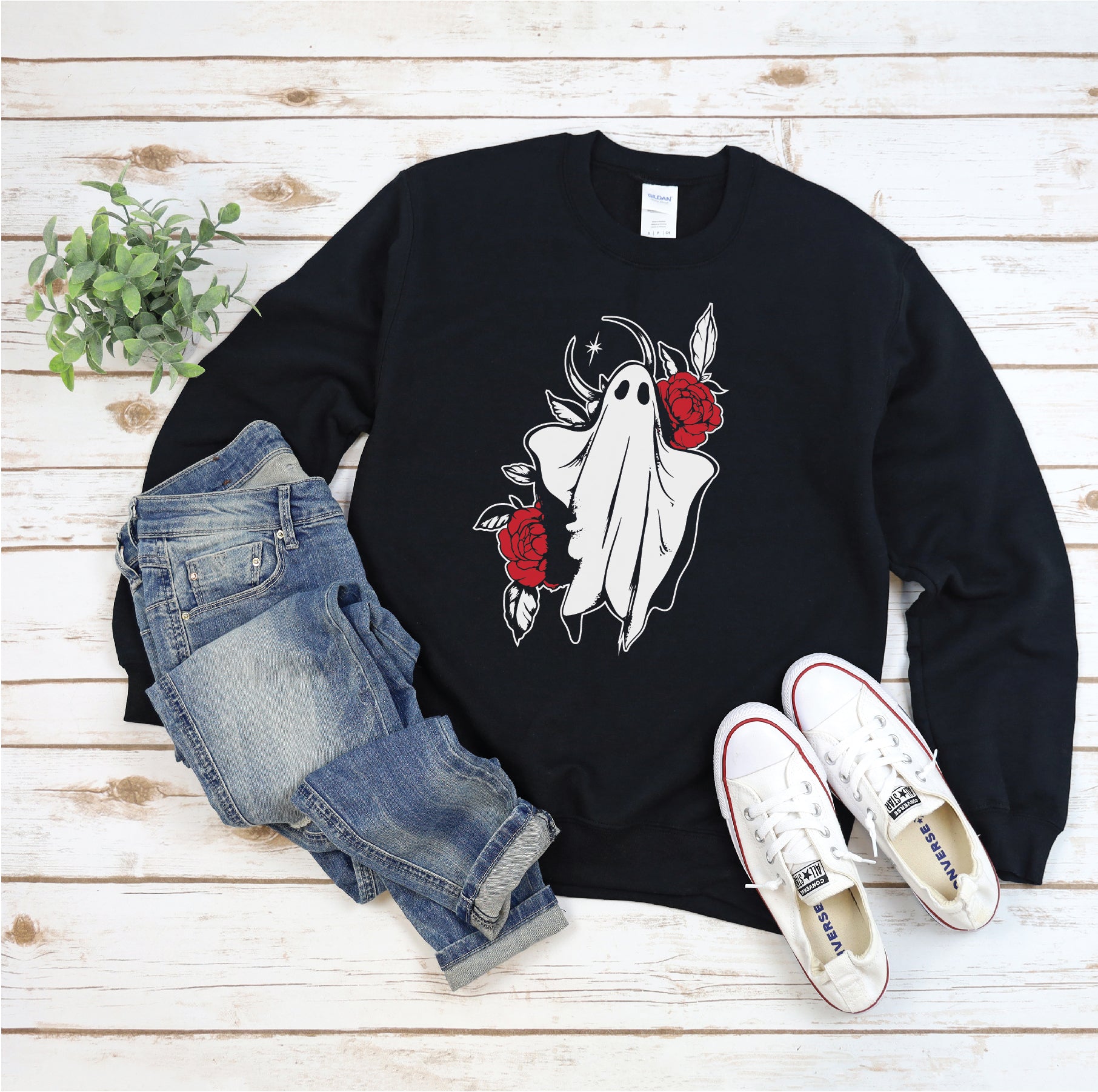 This sweatshirt brings spooky season to life with bold, tattoo-inspired art: a haunting ghost wrapped in red roses and celestial accents. Printed on a soft black crewneck, it’s equal parts eerie and romantic—perfect for chilly nights, haunted hayrides, or just embracing your inner moody ghoul - Original artwork with vintage tattoo flair, size up for that cozy oversized look..
